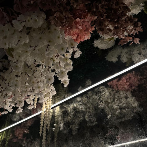 One of our most notable creations is the stunning ceiling installation at PDA, where the entire hallway is adorned with draping florals and complemented by floral statues and arrangements. Crafted from high-quality faux silk flowers that offer a realistic touch, our installations are designed to be both beautiful and durable, ensuring they stand out in any environment.